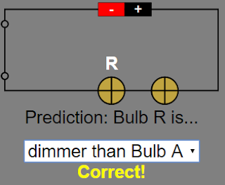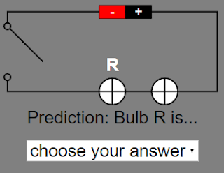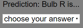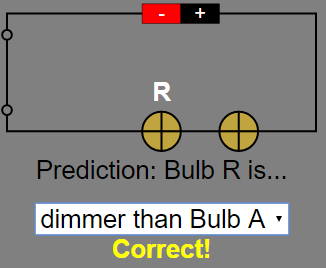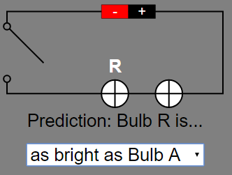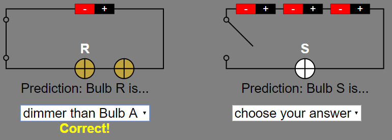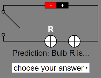 - Quiz: The "Grey Panel" includes a mini drop-down box quiz where students predict the brightness of a bulb in the circuit. "Predict the brightness of the bulb. The bulb with the label above is the indicated bulb. Step 1: Select an answer from the combo box. Selecting the wrong answer will not prompt you to the next question. Selecting the right answer will close the switch and the popup text will appear. The next question will appear on the right of the circuit."