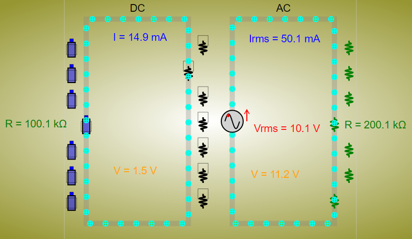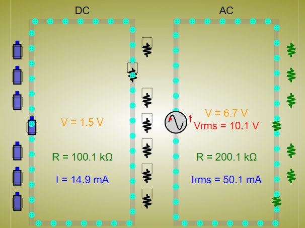 - The "Sliders" allow users to adjust the resistance of a resistor, the voltage of a battery (for DC), and the voltage of the AC source (for AC).