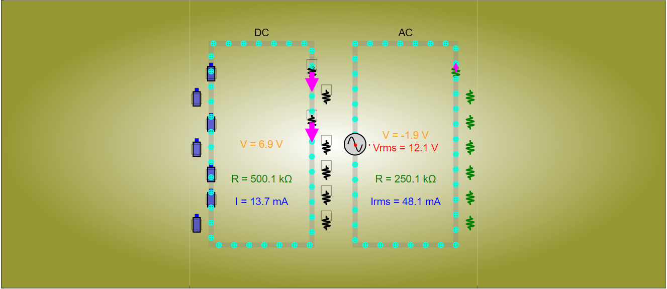 The Direct and Alternating Current Comparison Simulator is an interactive JavaScript simulation applet built using HTML5. It allows users to visually explore and compare the characteristics of direct current (DC) and alternating current (AC) within a circuit.