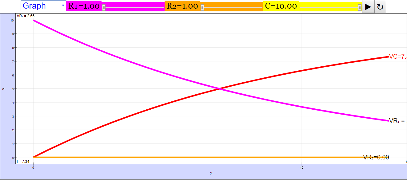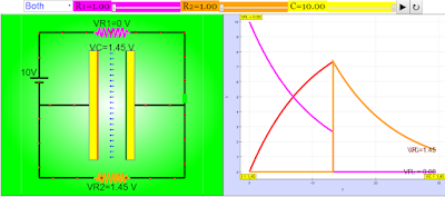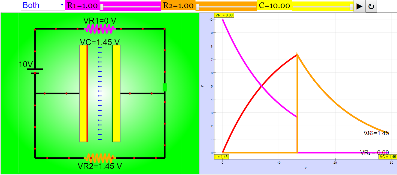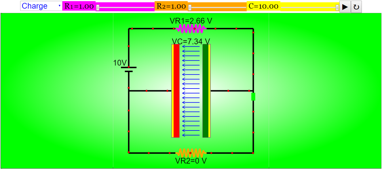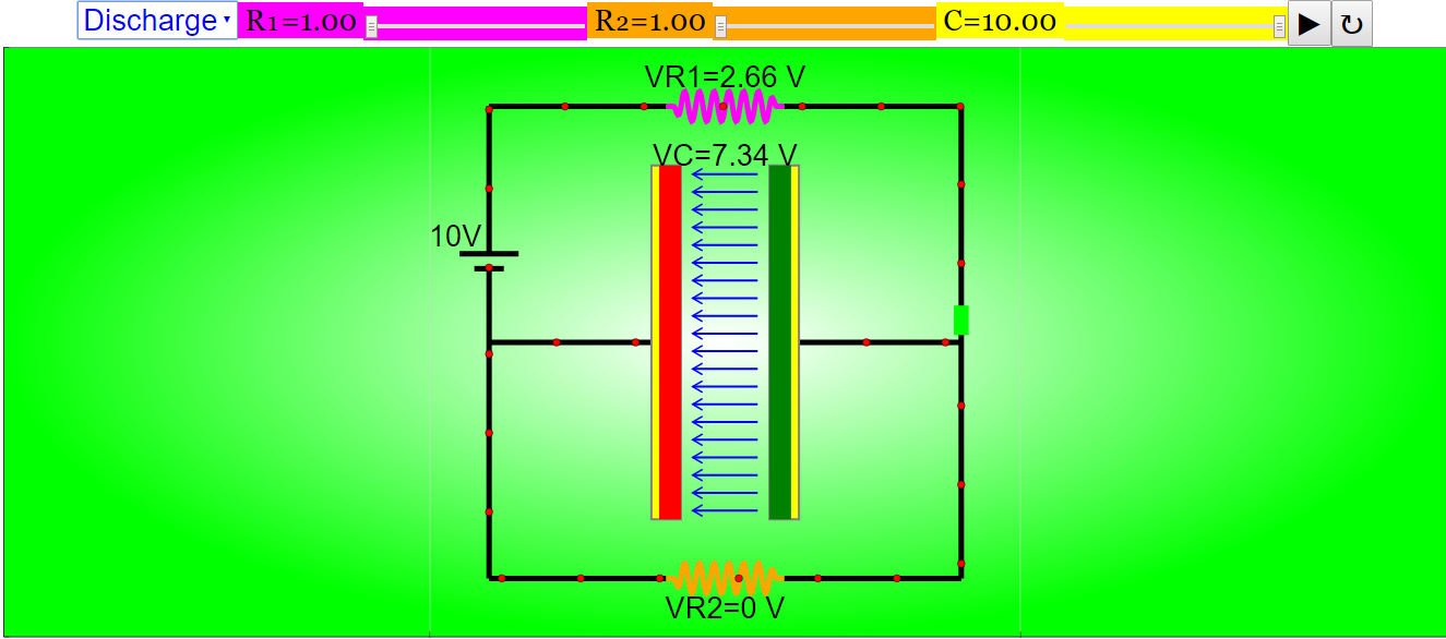- How can I interact with the simulation? The applet offers several interactive elements. You can toggle the display of different aspects of the simulation using a combo box, including a visual representation of the charge/discharge process, a graphical representation of the charge or current over time, and a combined view. Sliders allow you to adjust the values of resistors and the initial charge in the circuit, influencing the rate of charging and discharging. There are also play/pause and reset buttons to control the simulation's execution and return it to its initial state. Double-clicking within the panel toggles full-screen mode for better visibility.