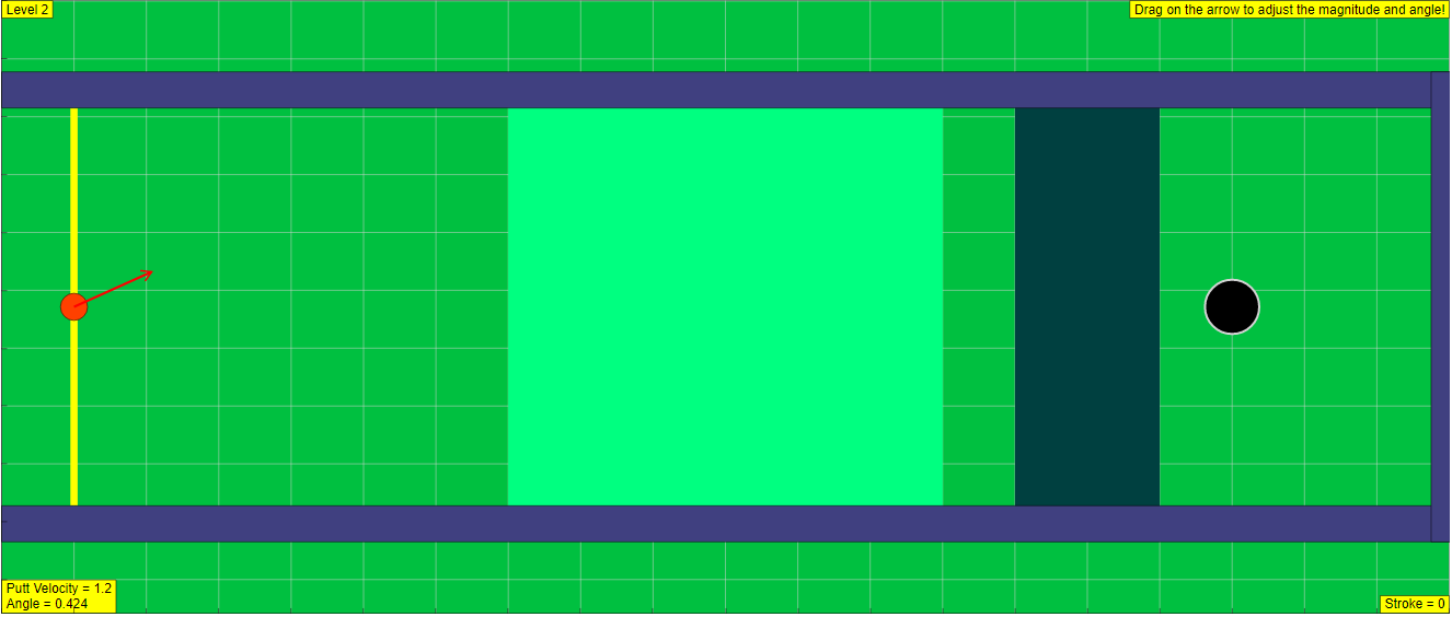 Players may change a few factors, the velocity of the putt, the direction of the ball, and the original ball placement, in order to accomplish this goal. The velocity is controlled by the input field, and the angle by the dial. Enter must be pressed after changing the velocity. Both of these variables, however, can also be manipulated by the hot spot on the tip of the arrow after the first shot. (I prefered that players use the panel elements at least once.)