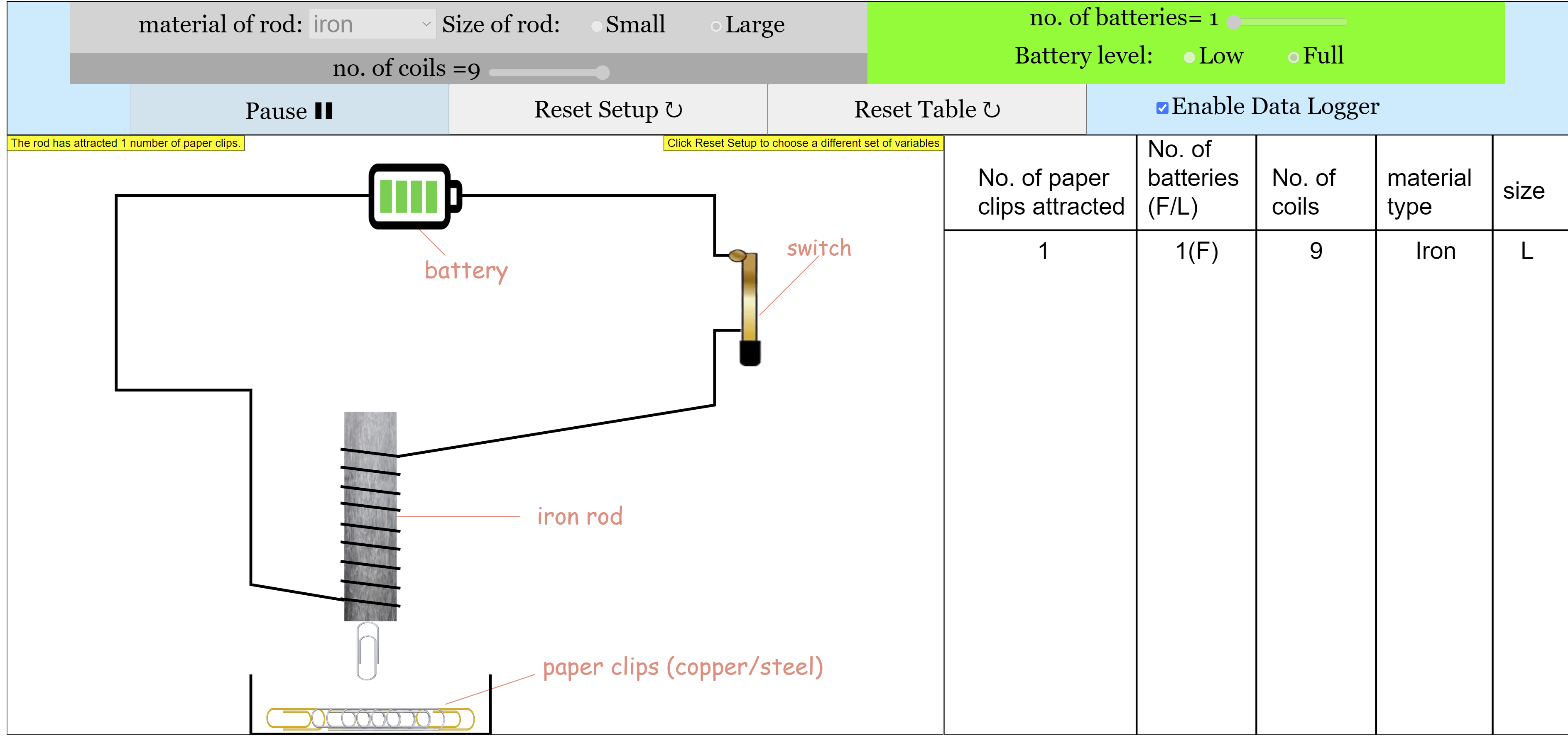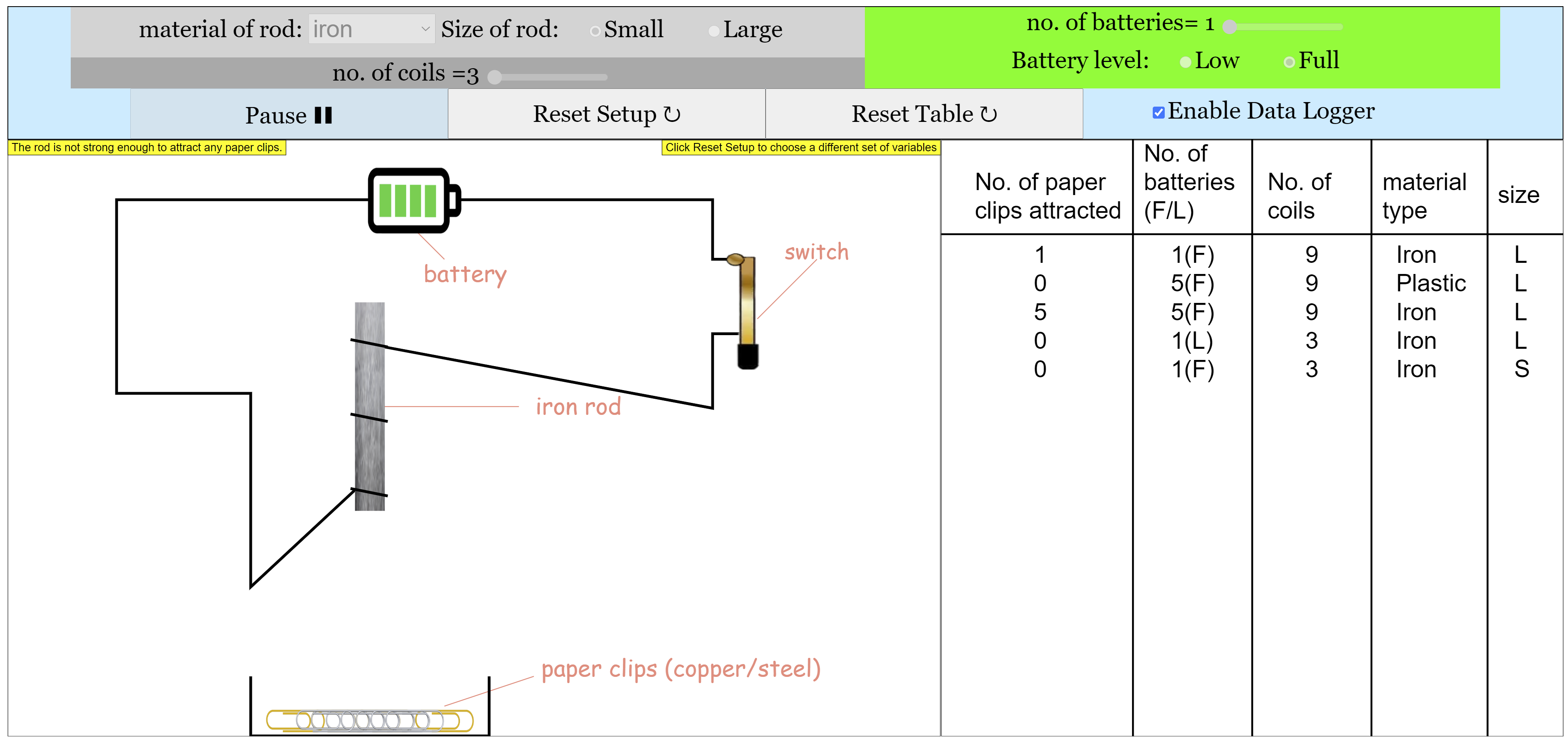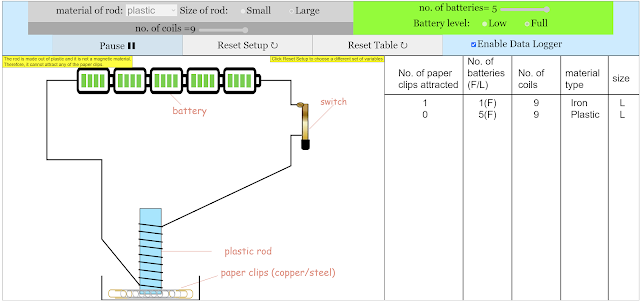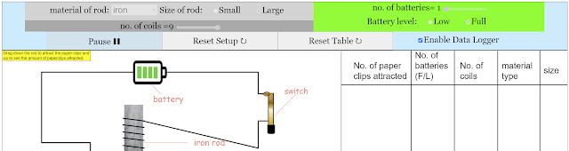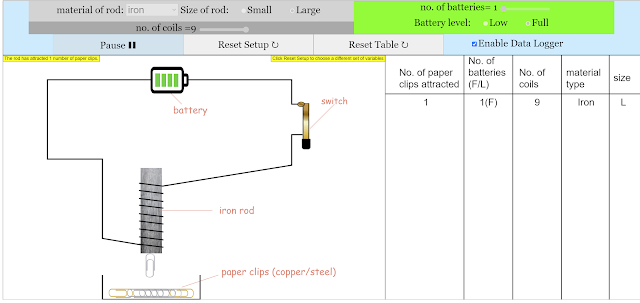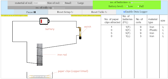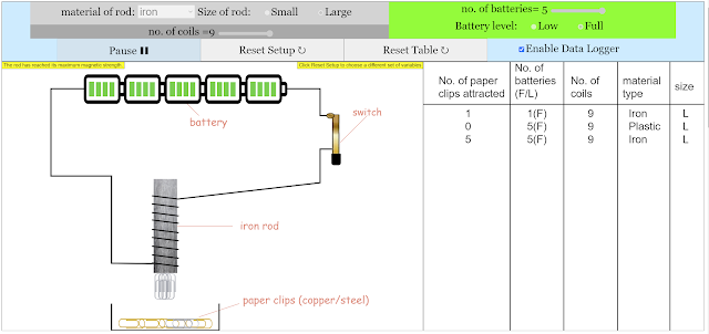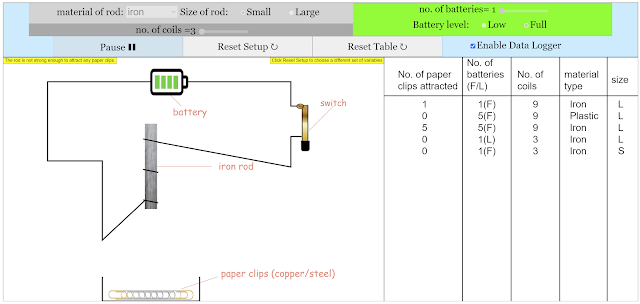 I used the virtual electromagnet experiment you created for SLS. [The simulation is]very good. I got the students to do the 2 experiments for changing the number of coils and number of batteries. I realized that they changed 2 variables [and] anyhow did [it]. Today get them to redo and snip it to submit it to me for monitoring.... so much better. I like this [this is] because [it is usually] very difficult to do a real experiment to see the trend. Thanks so much! Attached a sample of students' work.