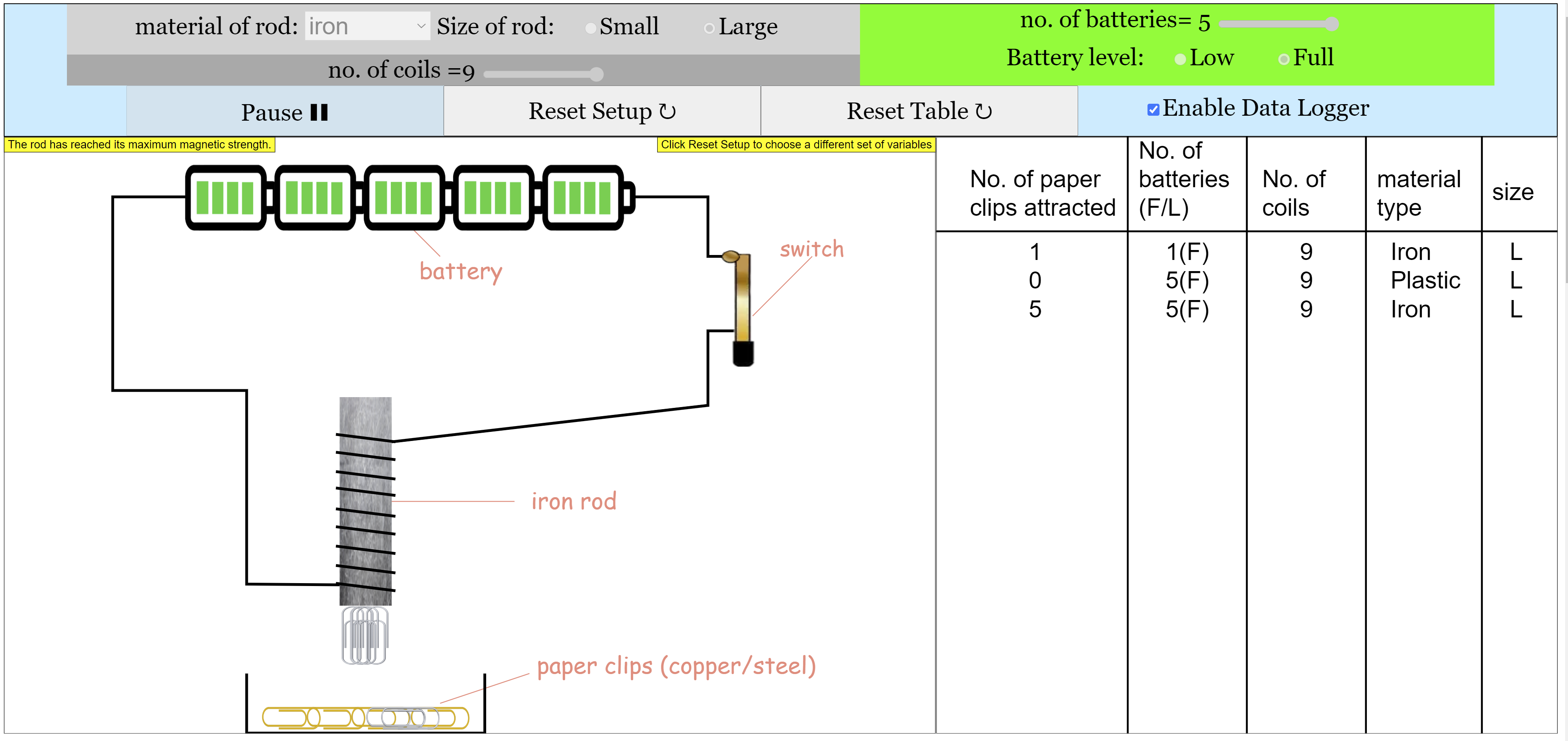 - Teacher Feedback: The second source includes a positive testimonial from a teacher who used the simulation for student experiments: "I used the virtual electromagnet experiment you created for SLS. [The simulation is]very good. I got the students to do the 2 experiments for changing the number of coils and number of batteries. I realized that they changed 2 variables [and] anyhow did [it]. Today get them to redo and snip it to submit it to me for monitoring.... so much better. I like this [this is] because [it is usually] very difficult to do a real experiment to see the trend. Thanks so much!" This highlights the value of the simulation in overcoming the practical difficulties of conducting real-world electromagnet experiments and visualizing trends.