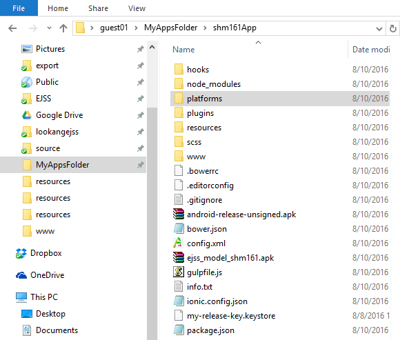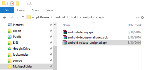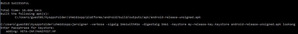- navigate to the folder C:\Users\guest01\MyAppsFolder\shm161App\platforms\android\build\outputs\apk and copy the file android-release-unsigned.apk into the Appfolder say C:\Users\guest01\MyAppsFolder\shm161App