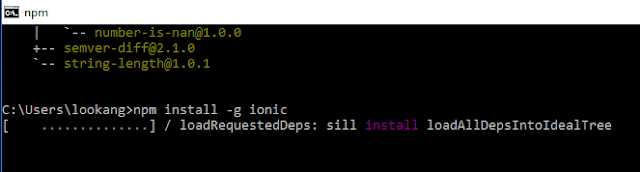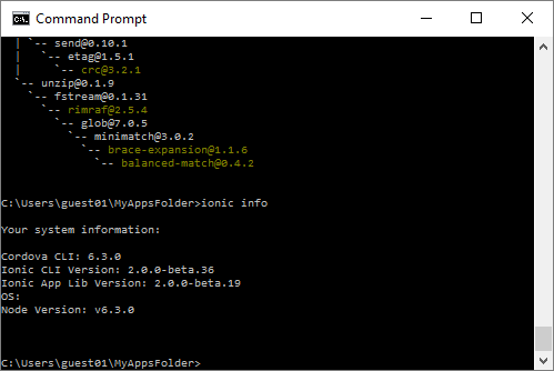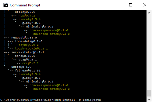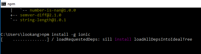- when installation may be slow and when is completed, the screen should look like this. The tasks in this step need to be done only once, no matter how many IONIC Apps you create.(Note: You need Internet connection for this.)