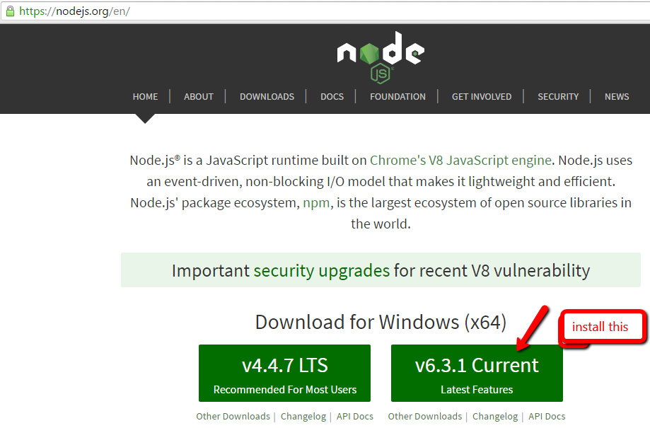 - Install Node.js version 6 or later in your computer system because of it's package ecosystem, npm, is the largest ecosystem of open source libraries in the world.