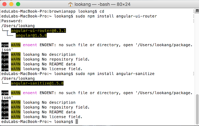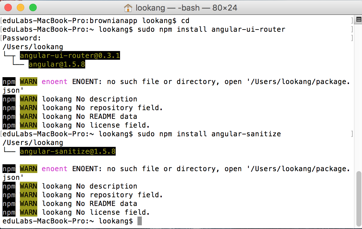 - npm install angular-sanitize (Installs an angular package for sanitizing content.) (Mac users may need to preface these with sudo, e.g., sudo npm install -g cordova)