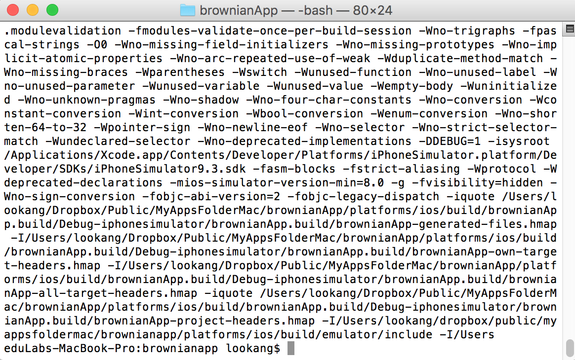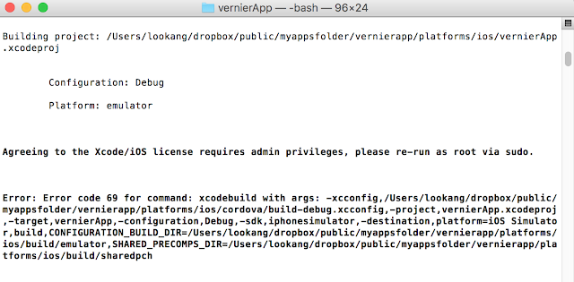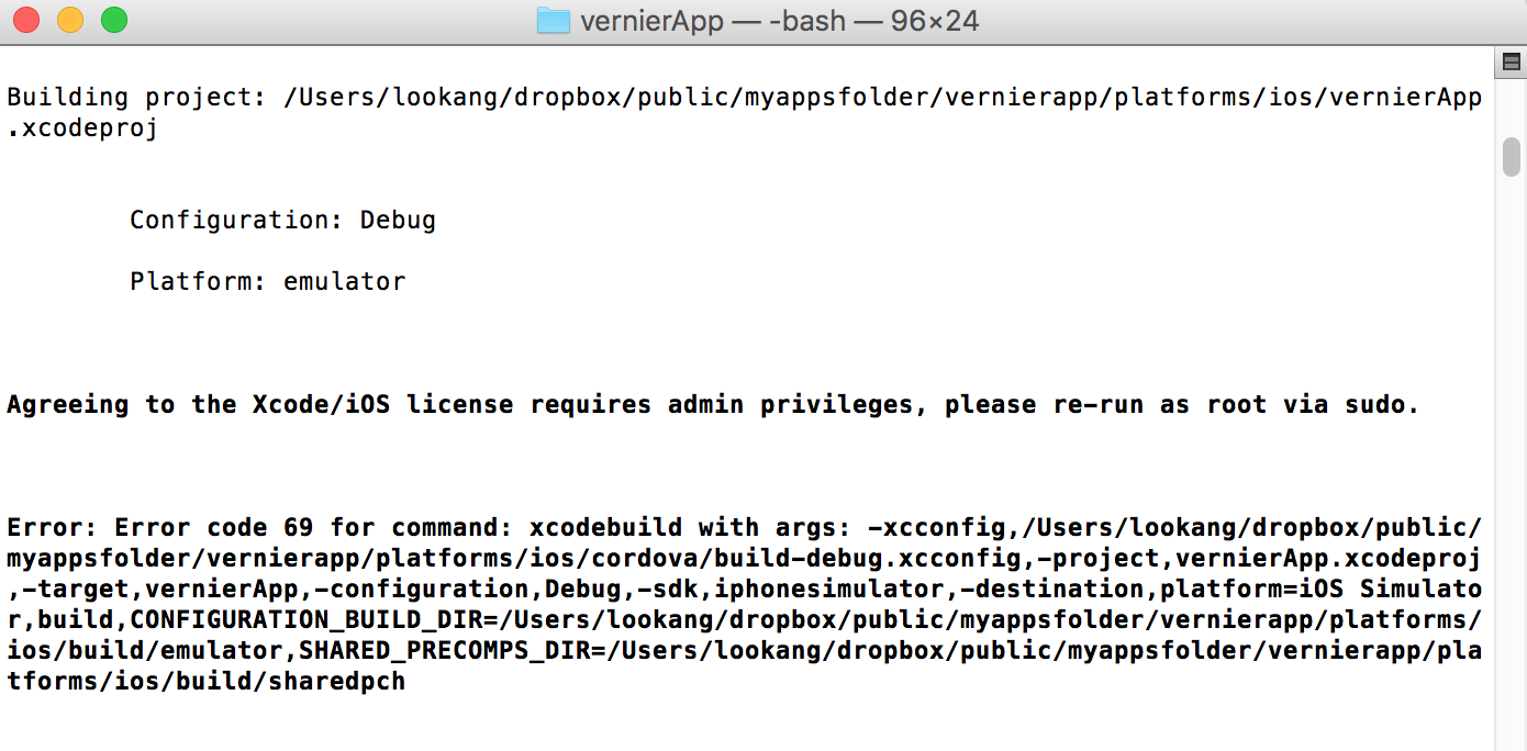 - Sometimes when changing computer from Windows and MacOSX, this error could happen.** BUILD FAILED ** The following build commands failed: CompileAssetCatalog /Users/lookang/dropbox/public/myappsfolder/vernierapp/platforms/ios/build/emulator/vernierApp.app vernierApp/Images.xcassets. to solve this problem type this to build the ios resources pictures icons and splash
