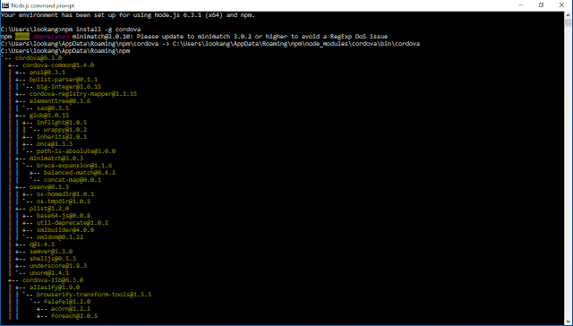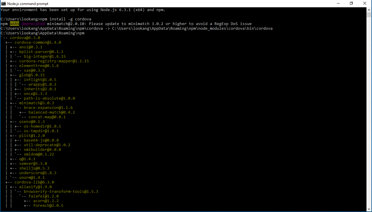 - you should see an output from installing cordova using the npm command implying it is successfully installed