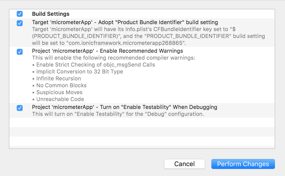 - How do I start building an iOS app from an Ionic project? The process begins with opening the Ionic project in Xcode, which will automatically initiate the build process. Xcode will typically identify errors initially, and will provide suggestions for correcting them. You should read these suggestions and accept the proposed solutions. This involves making some changes to the build settings, which usually involves accepting and "performing changes" in the Xcode interface. Subsequently, clicking the "play" button in Xcode will continue to build the project, but more errors regarding deprecations may arise. These must be addressed as well.