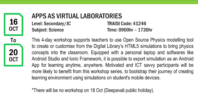 Motivated and ICT savvy participants will be more likely to benefit from this workshop series, to bootstrap their journey to create learning environment using simulations on student's mobile devices, bringing forward S’pore’s education system.