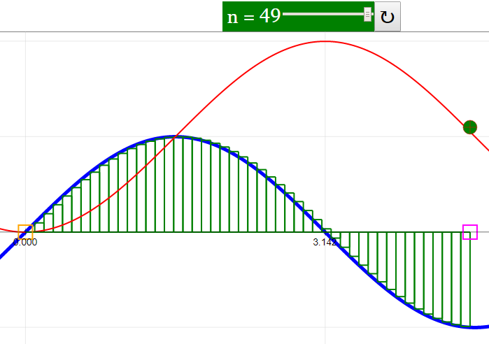 A second slider n defines the number n-1 of subinterval into which x2 - x1 is divided for the approximation. In each subinterval the approximative amplitude is assumed to be equal to its initial value. The sum of the area of all rectangles is shown by a green point at x2 .