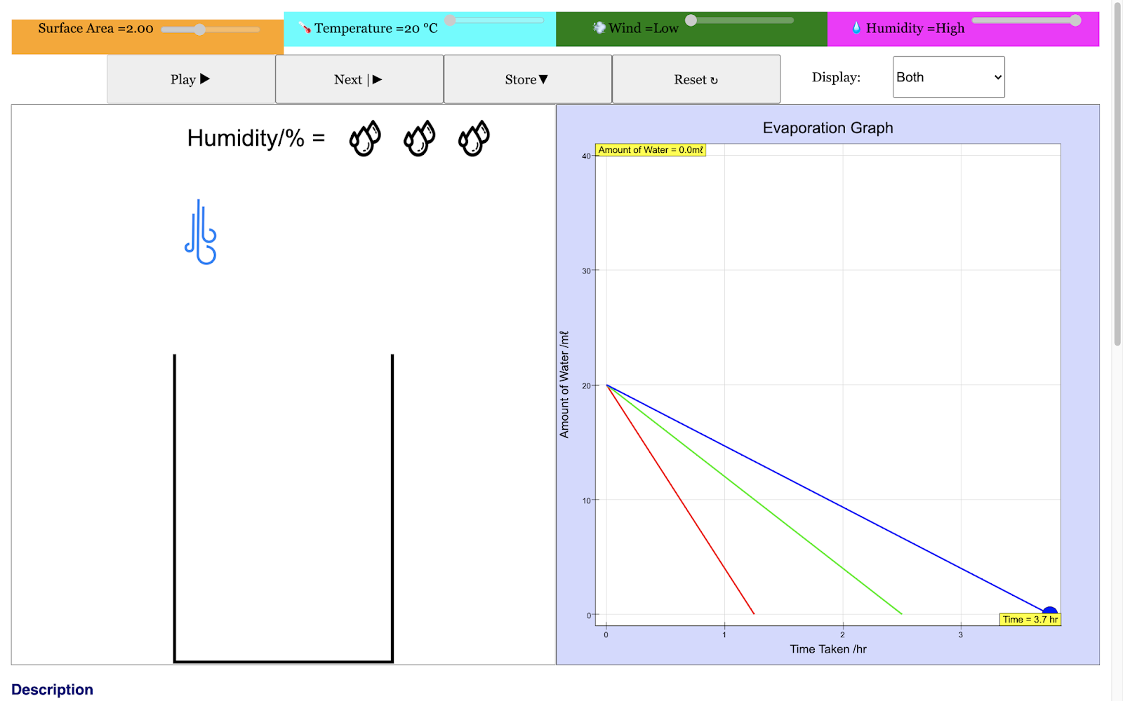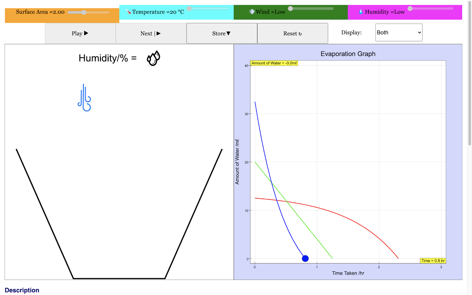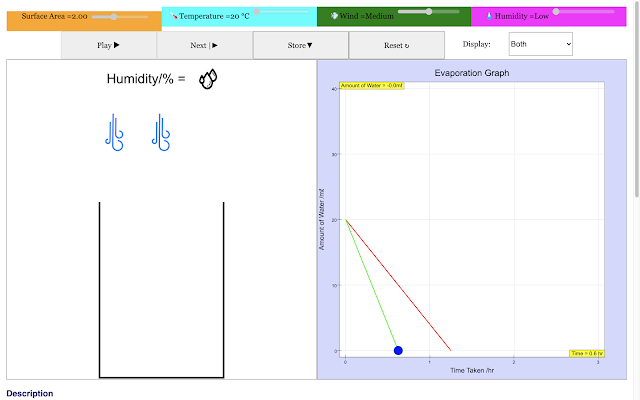 - An interactive HTML5 applet for secondary school that allows exploration of the effects of pressure, surface area, temperature, humidity, and wind on evaporation.