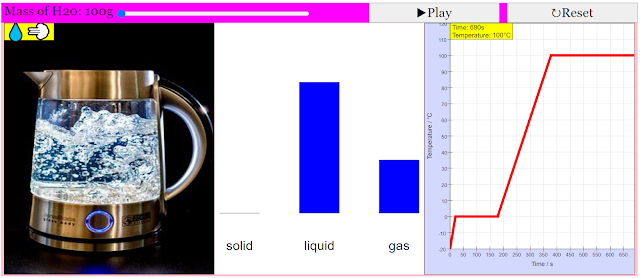 Quote: "This simluation features both a graph of temperature over time, as well as a 'world view' to facillitate the students' understanding of how the shape of the water changes as it undergoes various phase transitions."
