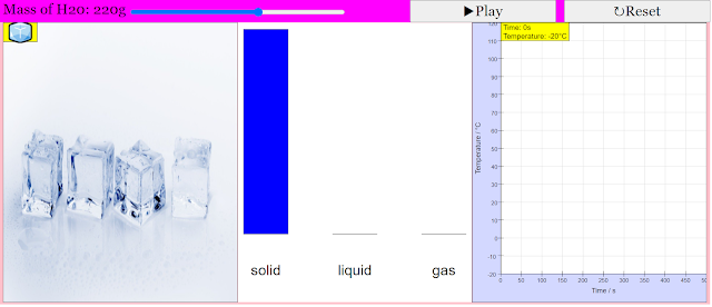 - What initial conditions are set in the simulation? By default, the simulation starts with a 100-gram sample of water at an initial temperature of -20°C (solid ice). However, users can adjust the initial mass of the water using a slider, up to a maximum of 300 grams.