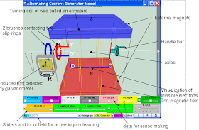 - Interactive 3D Model: The simulation features a 3D model of an AC generator. This allows students to visualize the different components (stator, armature, slip rings, brushes) and their interactions.